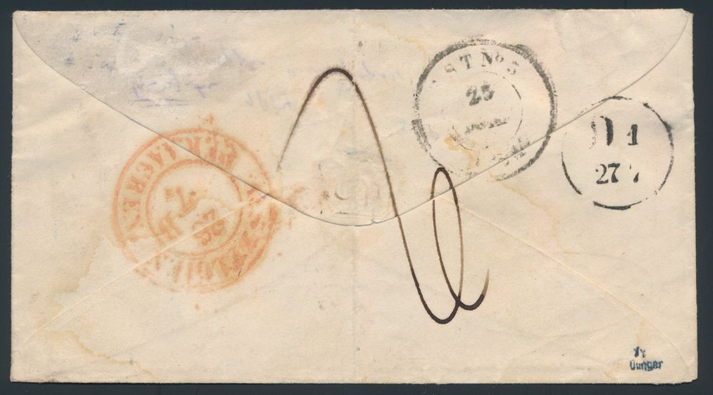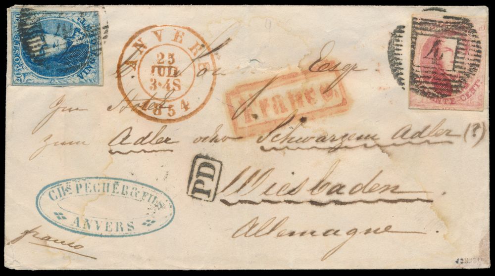 1092 image1854 N° 7 (fully margined) and 8 (incised), on letter envelope, cancelled P.4-Anvers, dated 25 July 1854, to Wiesbaden (Germany) with ambulantory stamp (Est N° 3) and frontier stamp Aachen, on front red stamp "Franco" (and manuscript "franco") in frame and "PD" in frame black, on reverse, round black stamp on two lines "D1/27 7", German part cancelled on reverse of 2 decimes, vf/f(Image 1) (Image 2)