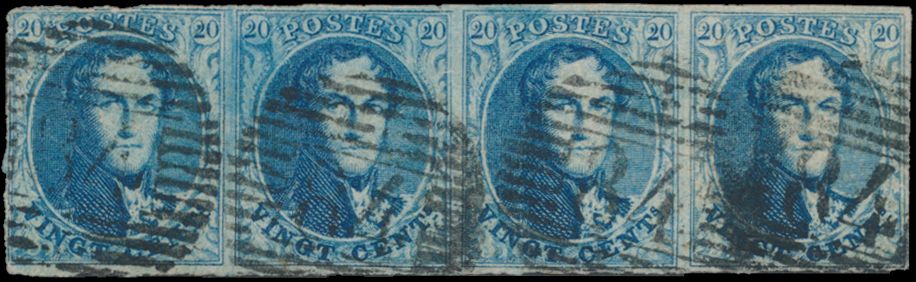 1081 0 imageN° 7 "20c. blue" in strip of four, with three fully margined stamps, cancelled P.84-Mouscron, with colour spots, vf (OBP ++€150)(Image 1) (All Images)