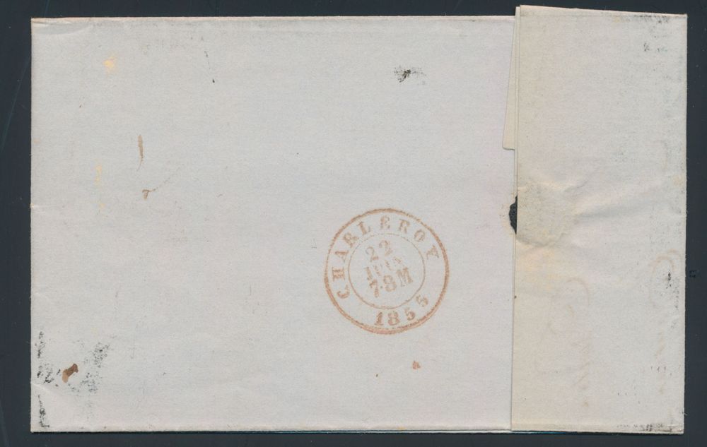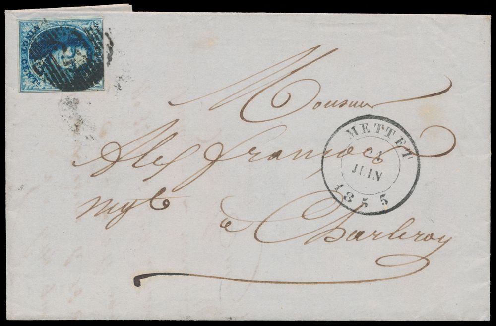 1100 imageN° 7 "20c. blue", on letter with contents, fully margined stamp, letter heading is Ermeton-sur-Biert, dated 21 June 1855, cancelled D.28-Mettet, to "Charleroy", vf(Image 1) (Image 2)