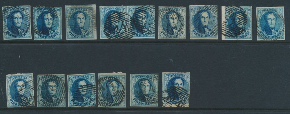 N° 7 "20c. blue", horizontal pair and 13 loose items, all