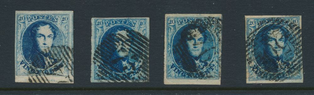 N° 7 "20c. blue", 4 fully margined stamps, some small