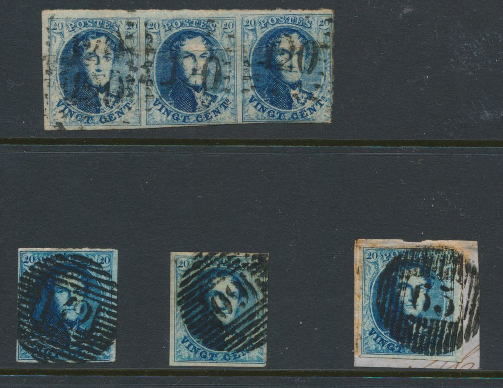 N° 7 "20c. blue" (6x), all fully margined and with margins +