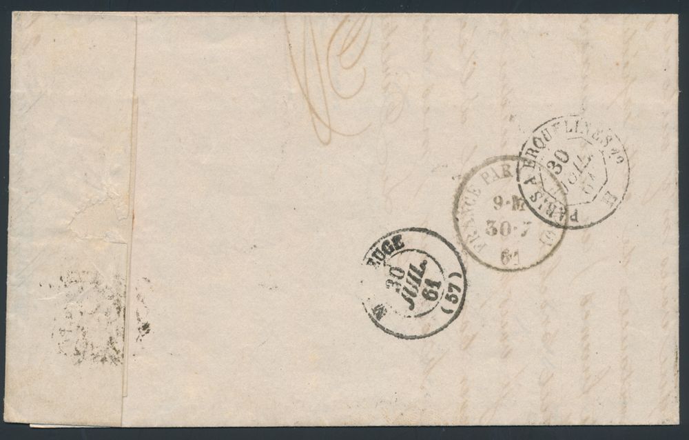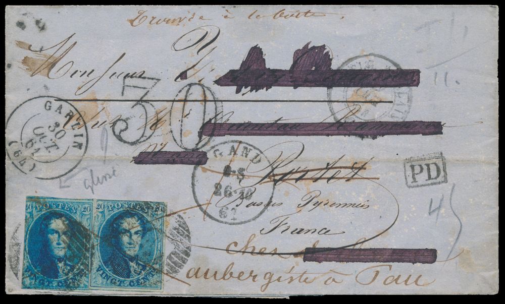 1237 image1861 N° 11 "20c. blue", twice on letter from Ghent, P.45 (14-bars), dated 26 October 1861, to Garlin (France), letter was forwarded from Garlin to Pau (departure stamp "Garlin 30 OCT. 61"), Belgian stamps were not valid and were annulled by the postal clerk with a cross and brought "30c." penalty charge (being "20c." charge + "10c." penalty charge), manuscript "trouve a la boîte", several postmarks present on the reverse, vf(Image 1) (Image 2)