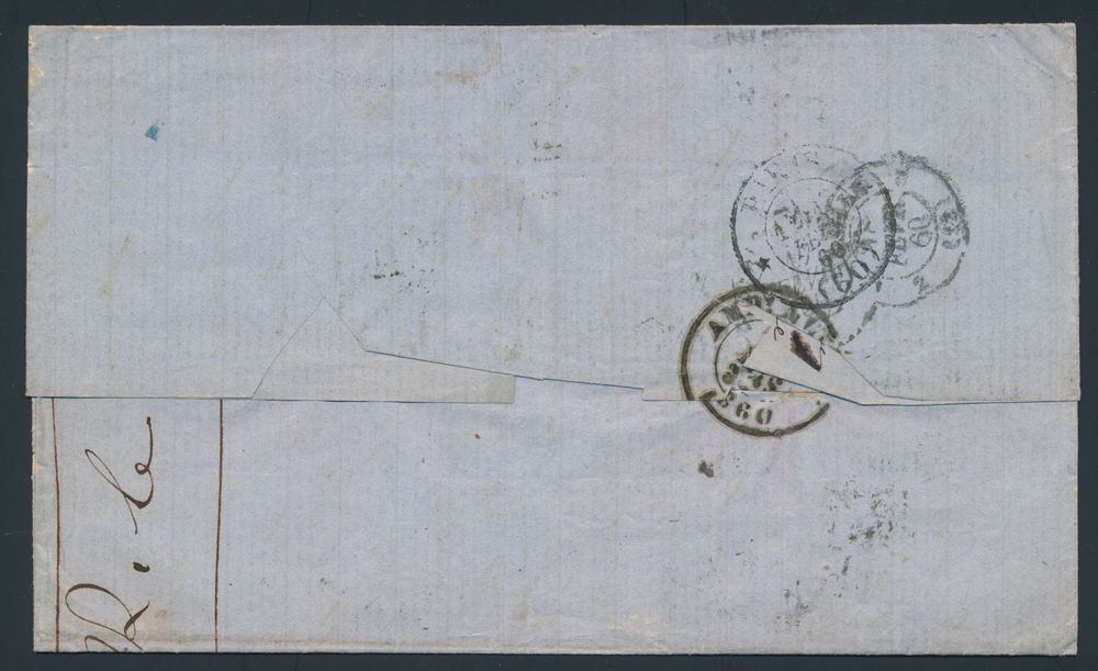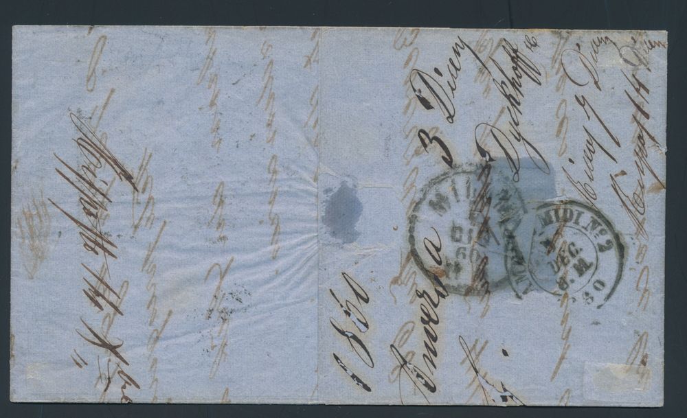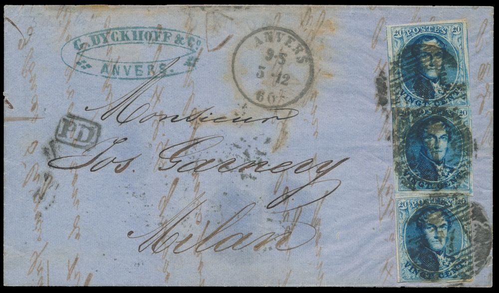 1235 image1860 N° 11A (3x) on letter with contents, cancelled P.4-Anvers, dated 3 December 1860, to Milan (Italy), "PD" stamp in box black, on reverse, stamp "MIDI 2" in black and receipt mark Milan, vf(Image 1) (Image 2)