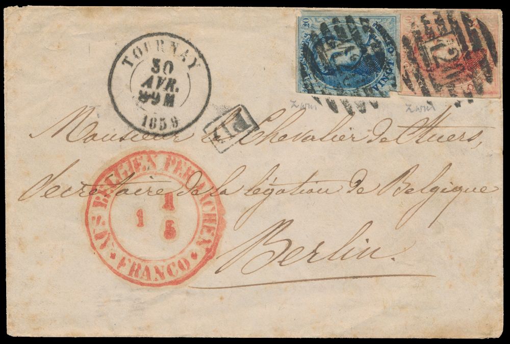 1233 imageN° 11A and 12A (both slightly incised), on cover, cancelled P.120-Tournai (8-bars), dated 20 April 1859, to Berlin (Germany), nice cancellation on front "Aus Belgien par Aachen FRANCO", "PD" in frame black, departure stamp is in black, on reverse nice cancellation circle cancel black in two lines "2/5 11-12Vf", vf/f(Image 1) (Image 2)