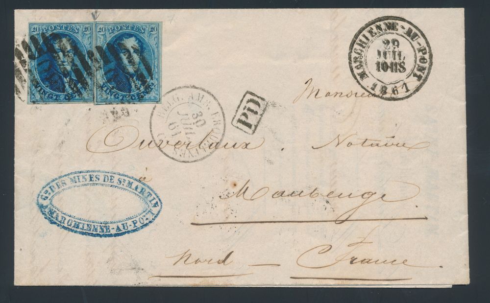 1231 imageN° 11 (2x), on letter from P.80 Sombreffe with departure stamp 'Marchienne au Pont' 29 Juil. 1861, with 'PD' in frame (black) to France, vf (OBP €40 + Coba €25)(Image 1) (Image 2)