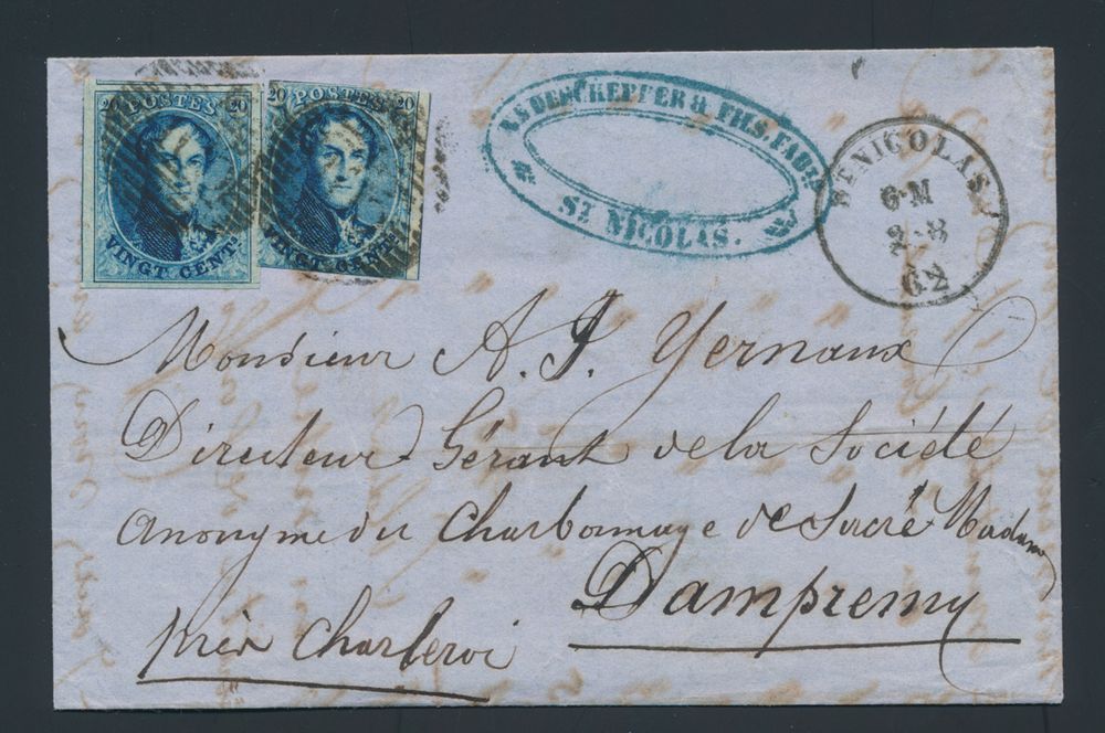 1238 image1862 N° 11 "20c. blue", two ex. on letter with contents, 1 fully margined stamp with 4 neighbours and extension lower frame line left and right, 2x incised, from P.105-Sint-Niklaas (P105), dated 2 August 62, to Dampremy (with manuscript "Près Charleroi", double postage inland, more than 30 kilometres, no indication of weight, vf(Image 1) (Image 2)