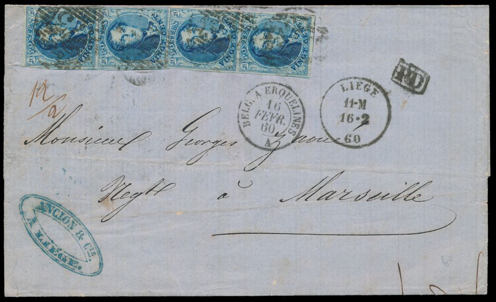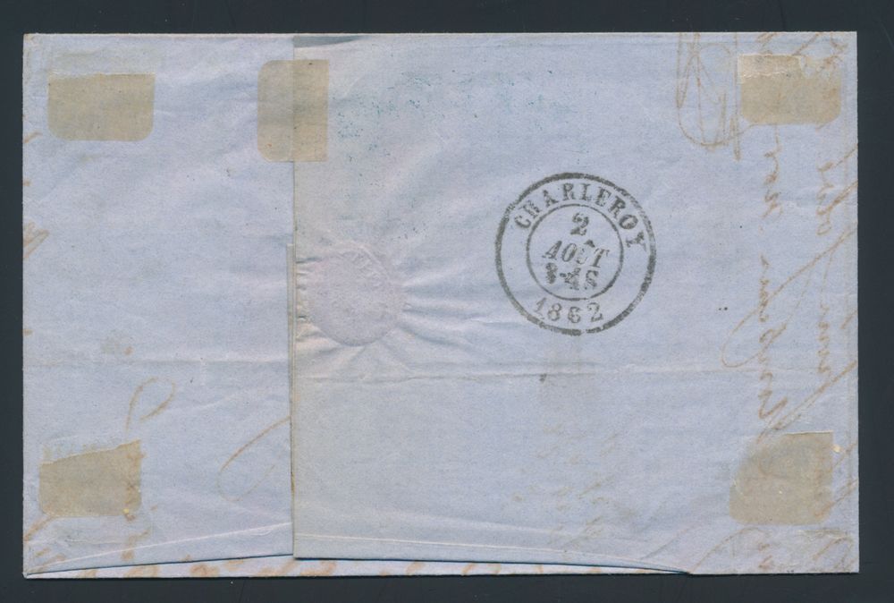 1236 image1860 N° 11A "20c. blue", 2 upright pairs, both fully margined, from Liège, dated 16 February 1860, to Marseille (France), manuscript "12/2", 12gr. which indicates double charge abroad, "PD" in frame black, rare upright pairs for foreign letter, vf(Image 1) (Image 2)