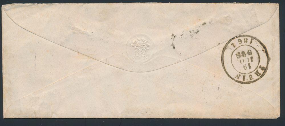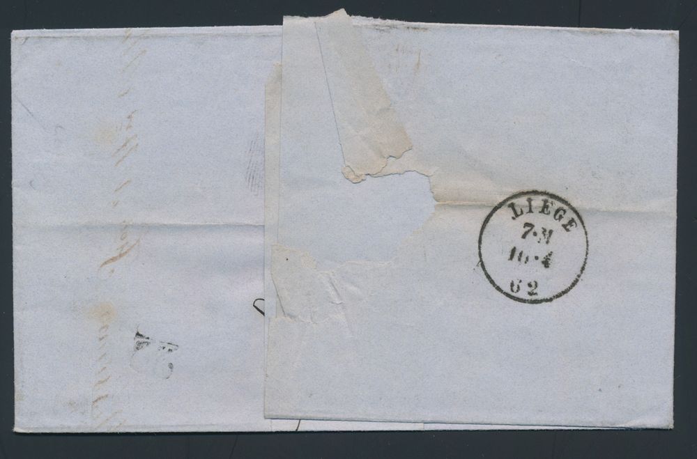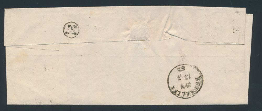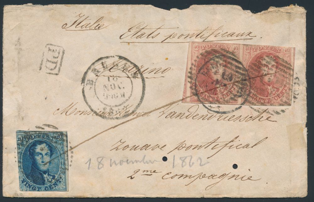 1229 imageN° 11 and 12 (in pair, w.e.f. 1 stamp fully margined and with neigbour), on letter from P. 23 Bruges 18 Nov 1862, to Marino (Castel Condulfo) Papal States, the letter is addressed to a Papal Zouave 'Henri Van den Driessche', 2° Company, rate : 1 franc via France (up to 7.5 grams), back 'France par Mouscron', beautiful, rare destination and addressing!(Image 1) (Image 2)