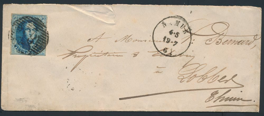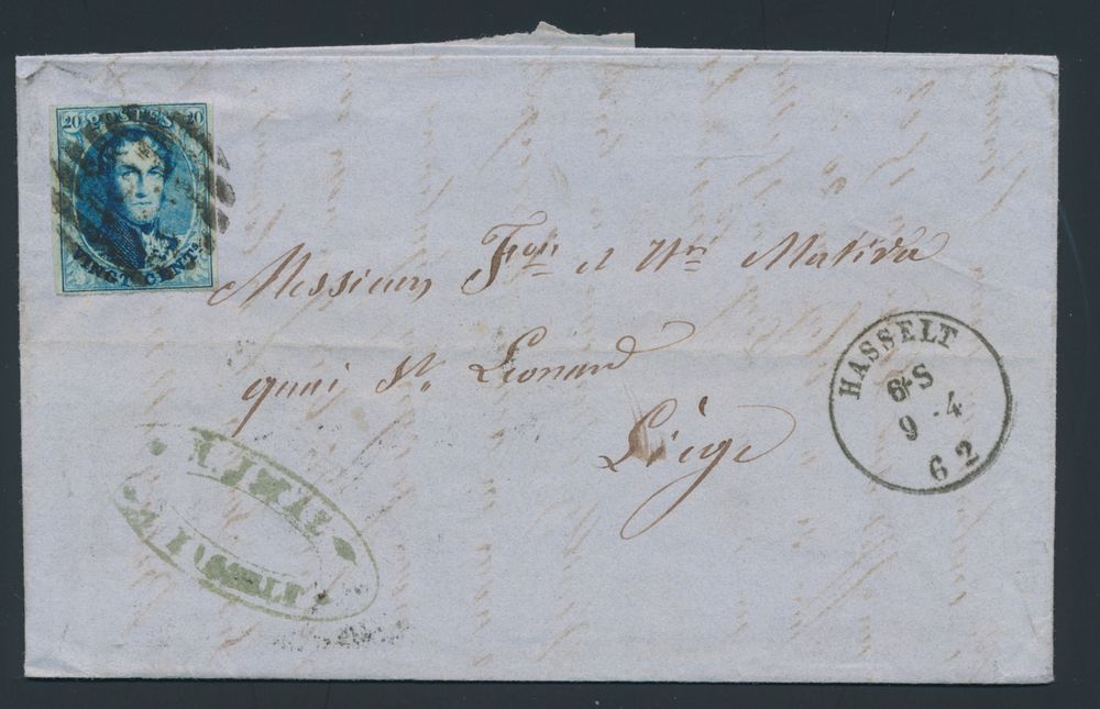 1239 image1862 N° 11 "20c. blue" on letter from P.57-Hasselt (8 lines), nice fully margined, 9-4-1862 to Liège, vf(Image 1) (Image 2)