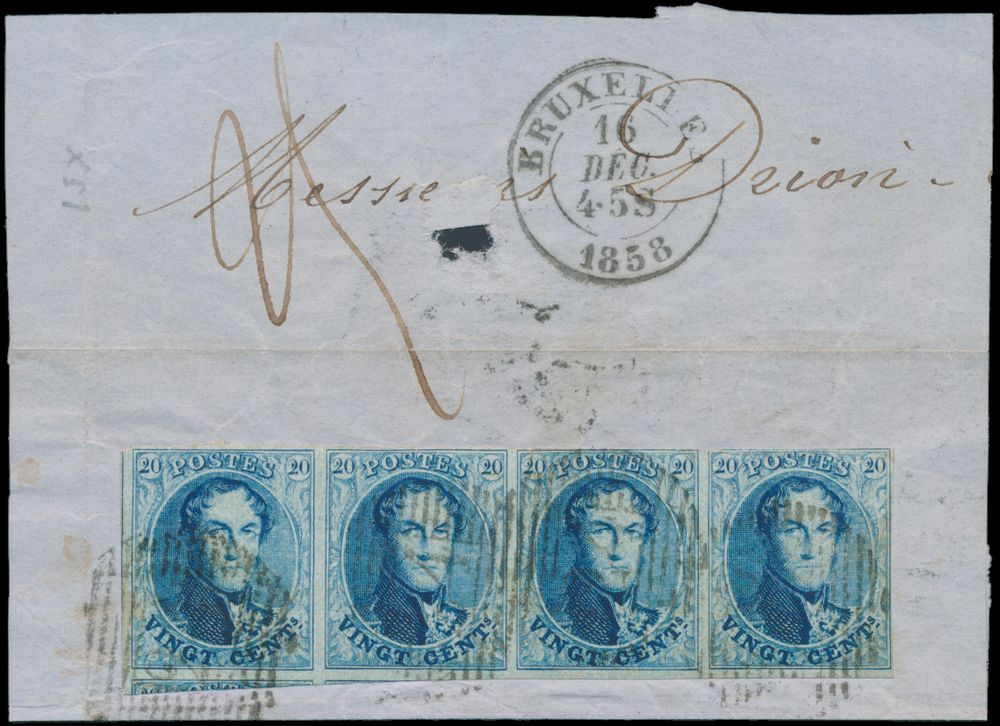 1234 image1858 N° 11 "20c. blue", in strip of 4, (3 fully margined stamps, one close), with neigbour, cancelled P.24-Bruxelles, dated 16 December 1858, on small fragment, vf (OBP ++€150)(Image 1) (All Images)