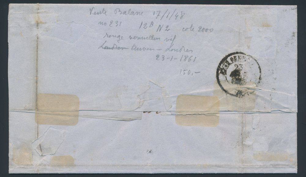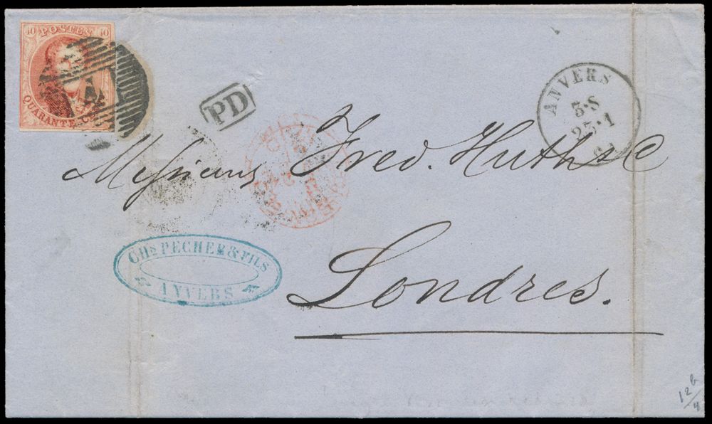 1264 image1861 N° 12Ab "40c. bright vermilion red", fully margined with contents, from Anvers (P.4), dated 23 January 1861, to London, "PD" in box black, vf (OBP €250)(Image 1) (Image 2)