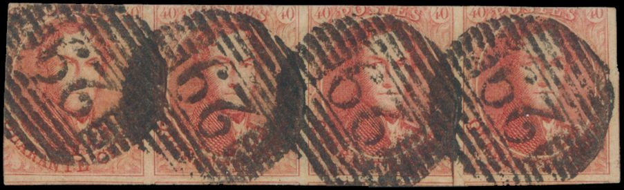 1263 0 imageN° 12Ab "40c. bright vermilion red", in strip of 4, not fully margined, with 6 neigbour, cancelled P.29-Kortrijk, f/to be checked(Image 1) (All Images)