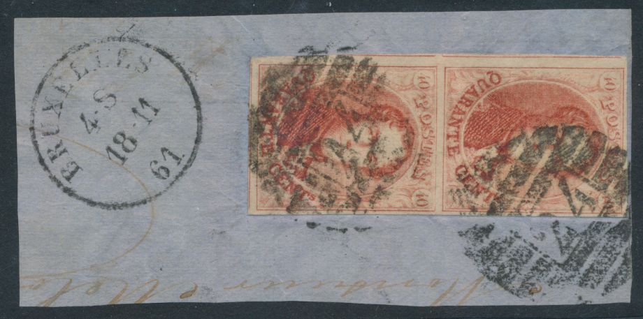 1283 0 imageN° 12A "40c. vermilion", in right-hand pair, on fragment, fully margined, with three full neigbour, cancel P.24 (8-bars) - Brussels, dated 18 November 61, vf (OBP €300)(Image 1) (All Images)