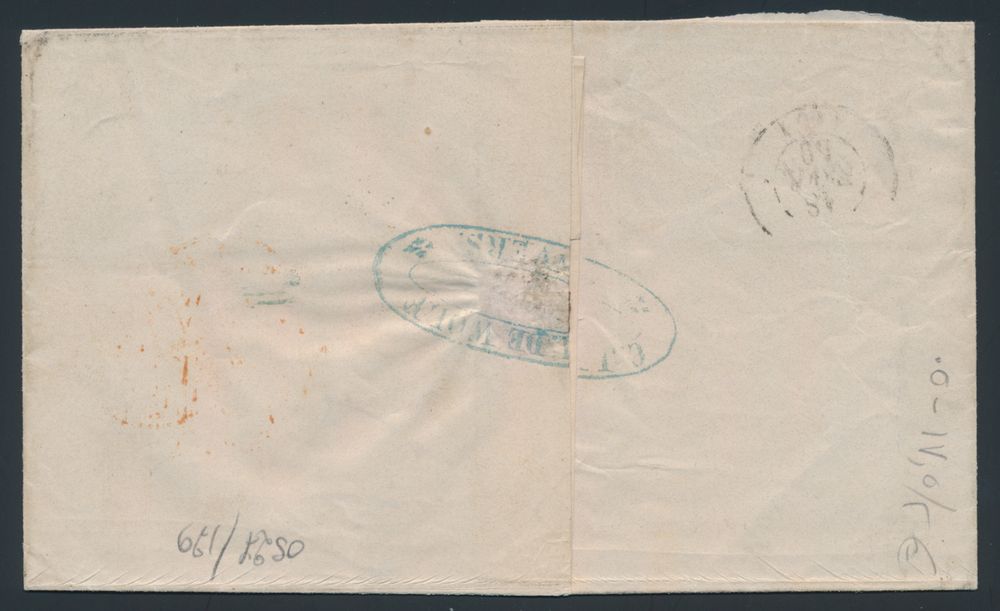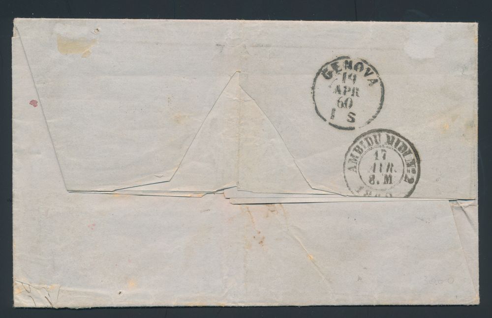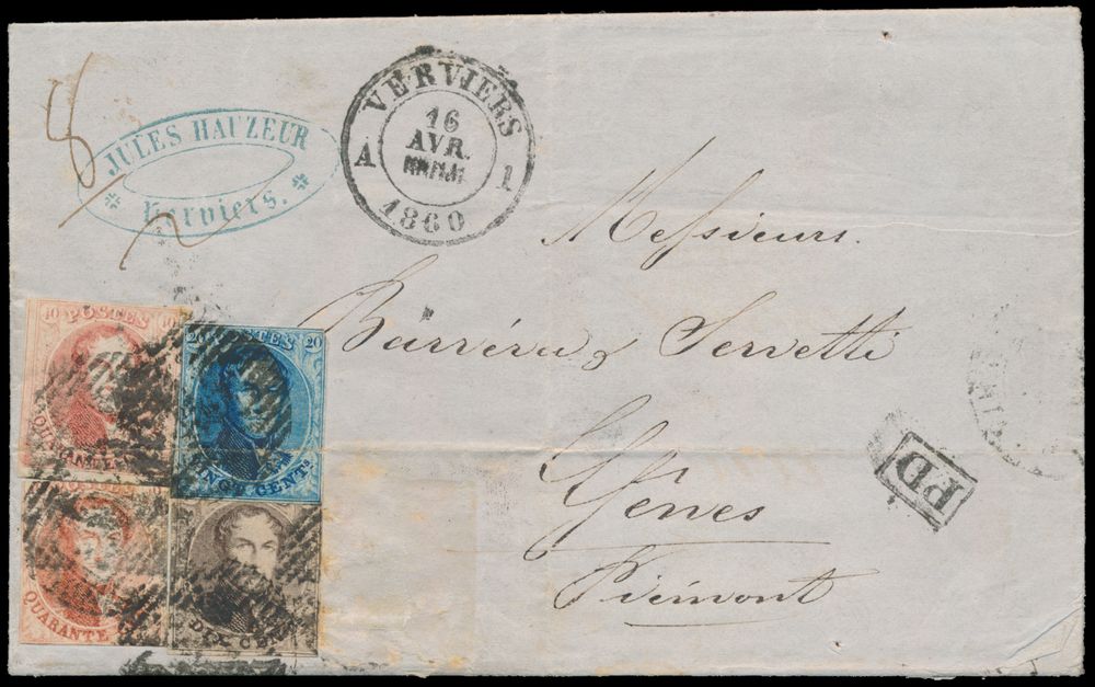 1293 image1860 N° 10A, 11A and 12A (2x) on letter with contents, cancelled P.123 A1-Verviers, dd. 16 April 1860, Genes (Piedmont-Italy), on reverse nice cancelled "Ambt. Du Midi N° 2" and Genova, dated 19 April 60, manuscript "8/2" - double postage abroad, franked "1.10 francs", vf/f(Image 1) (Image 2)