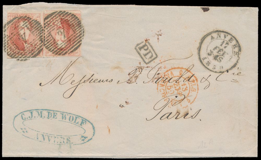 1289 image1859 N° 12A "40c. vermilion", 2 ex. (1 fully margined with curiosity "Extended framljin" and 1 left incised with multiple neigbour, on letter without contents, from Anvers (P.4), dated 17 February 1859 to Paris (France), "PD" in box black, double postage abroad France, vf(Image 1) (Image 2)