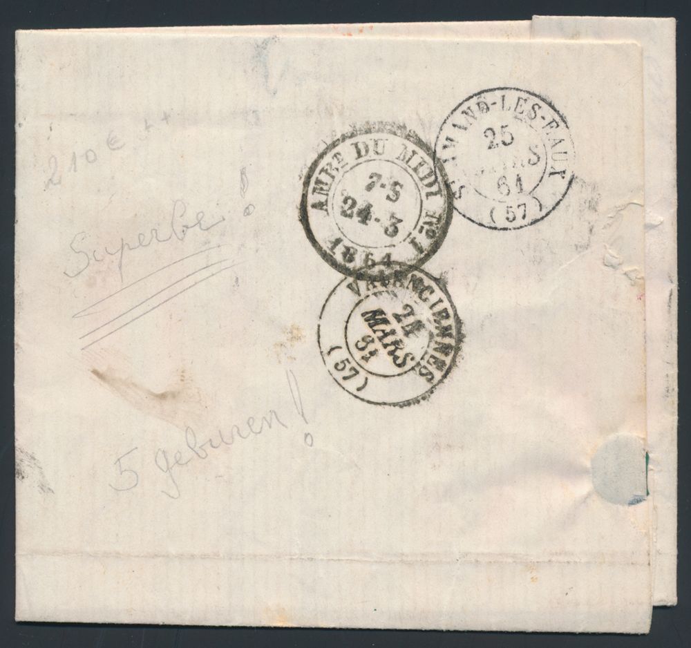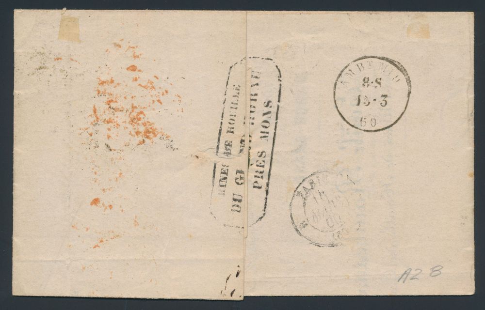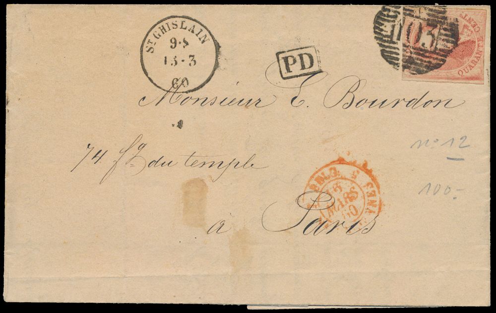1296 image1861 N° 12A "40c. vermilion", fully margined (with left neighbour and colour spot in margin), on letter with contents, letter to Grand-Hornu, cancelled in P.103-St.-Ghislain, dated 15 March 1860, to Paris (France). Nice cancellation on reverse of 'AMBT MIDI', PD in box black, vf (OBP €210)(Image 1) (Image 2)