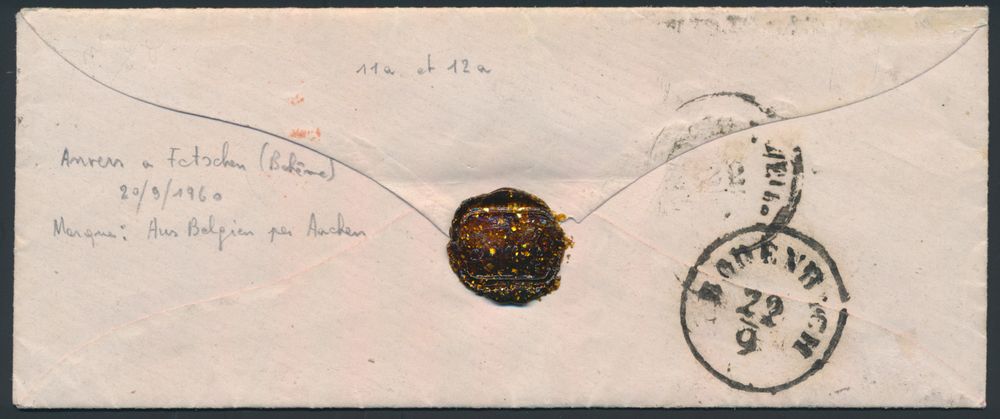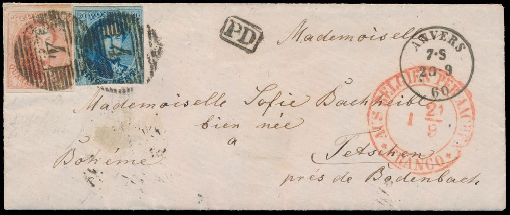1292 image1860 N° 11 (incised) and 12 (fully margined), on cover with letter (dates correspond), from Antwerp, dated 20 September 1860, to Tetschen "près de Bodenbach" (Boheme), nice red cancellation on front "AUS BELGIEN PER AACHEN * FRANCO *", vf/f(Image 1) (Image 2)