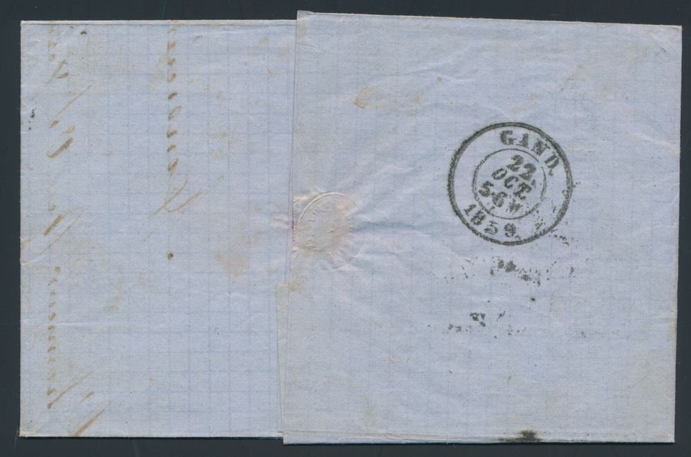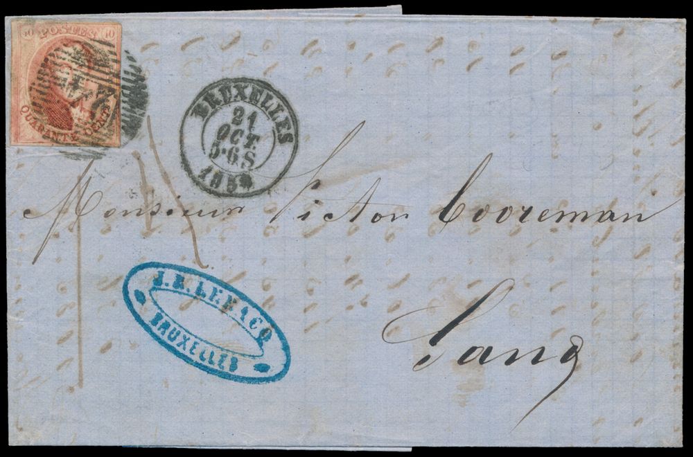 1291 image1859 N° 12A "40c. vermillion", fully margined on letter with contents, cancelled P.24-Bruxelles, dated 21 October 1859, to Gand. Double charge inland over 30 kilometres, vf (OBP €210)(Image 1) (Image 2)