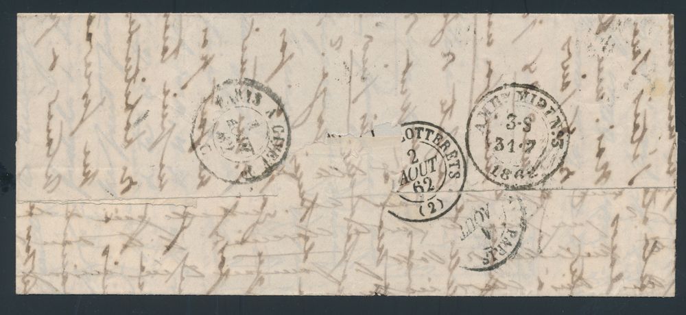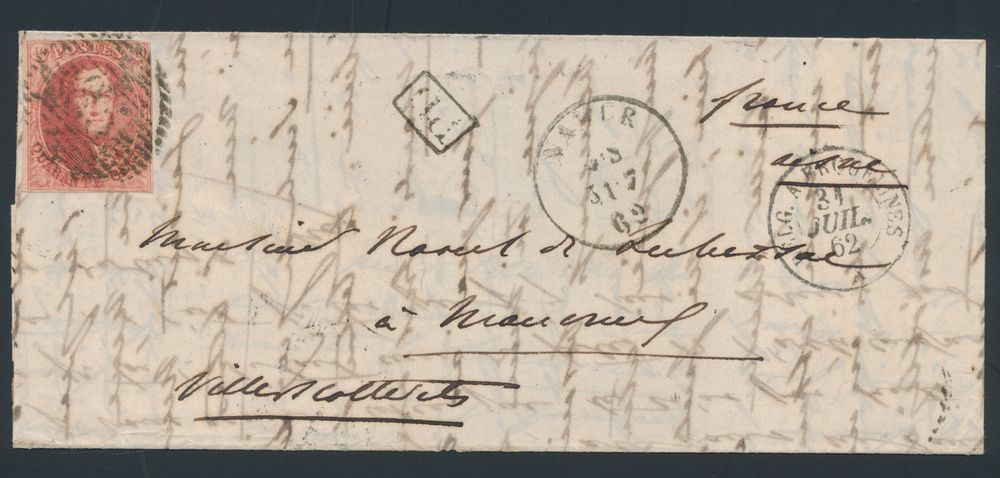 1297 image1862 N° 12a "40c. crimson" on letter with contents, from Namur (P.85), dated 31 July 62 to France, with some nice cancellations on the reverse, "PD" in box black, vf (OBP €185)(Image 1) (Image 2)