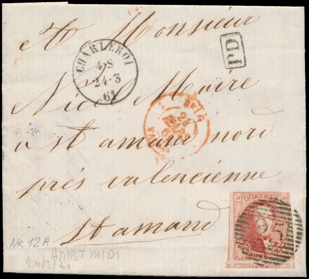 1294 image1861 N° 12 "40c. vermillion", fully margined with preferably 5 neigbour, on letter with contents, cancelled P.25-Charleroi, dated 24 March 1861 to Saint Amand (France), with arrival postmark Saint-Amand-Les-Eaux, vm (OBP €210)(Image 1) (Image 2)