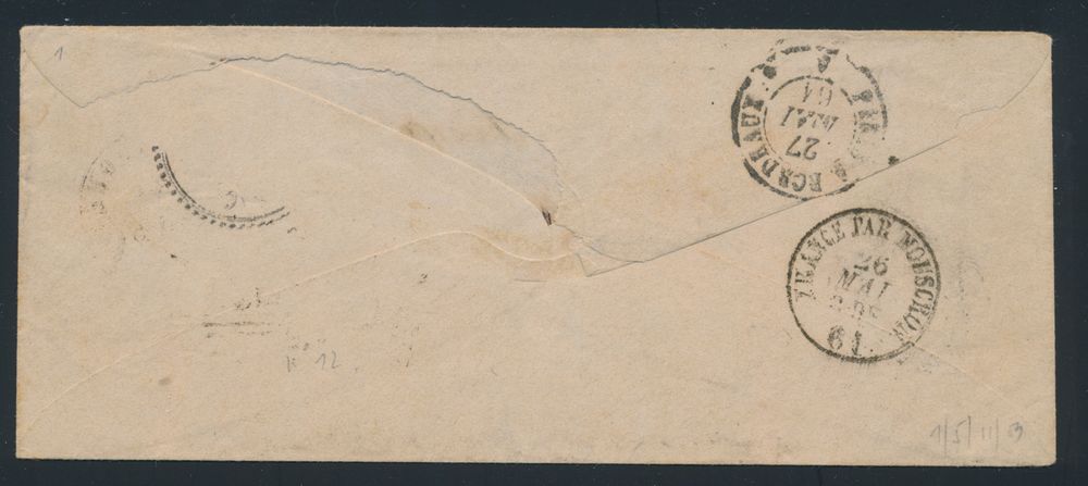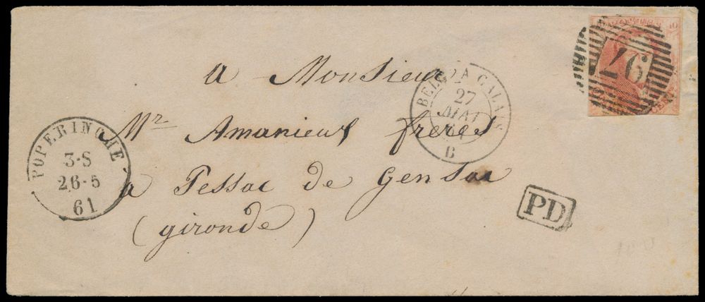 1295 image1861 N° 12 "40c. vermillion", letter envelope without contents, cancelled P.97-Poperinghe, not fully margined, dated 26 May 1861, to Pessac de Gens (France - Gironde), "PD" in box black, vf(Image 1) (Image 2)