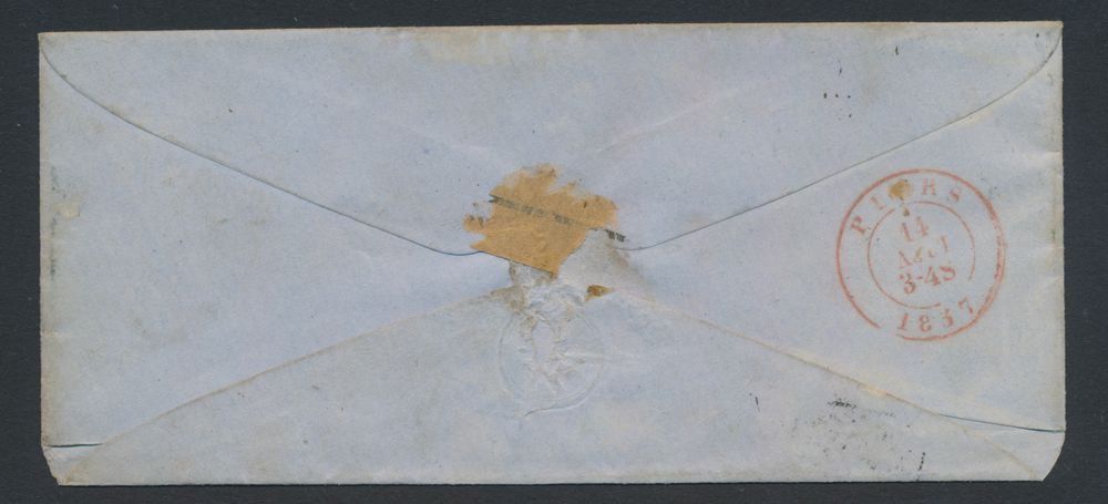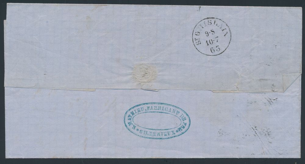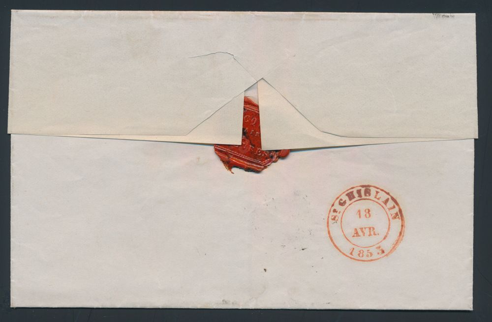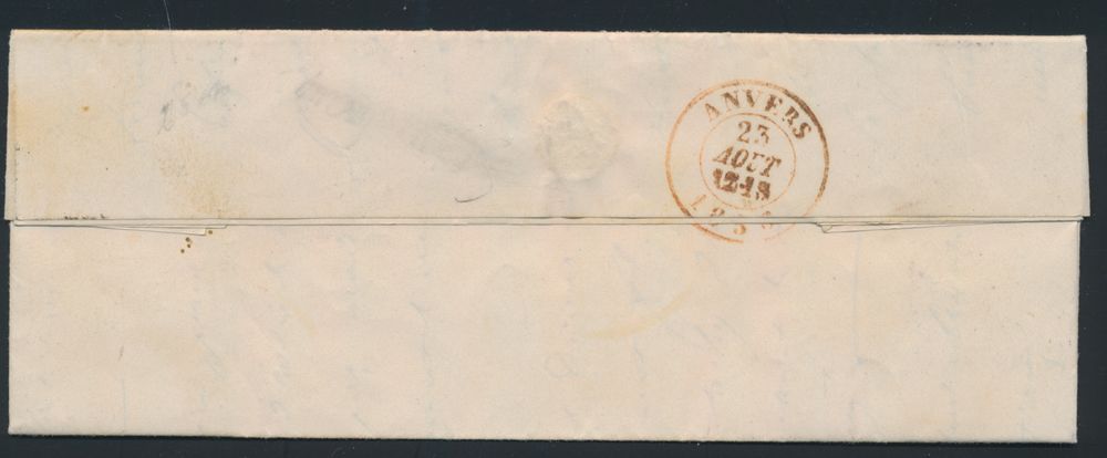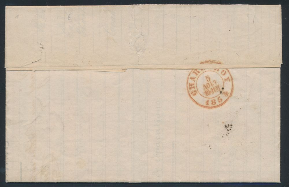 1327 image1856 N° 7 "20c. blue", letter with contents, cancelled P.101-Rochefort, not fully margined, dated 21 August 1856, to Anvers, post box "F" in circle black, not described in "La Poste Rurale" in 1850 or in 1868, manuscript "Seringchamps" in the document, vf(Image 1) (Image 2)