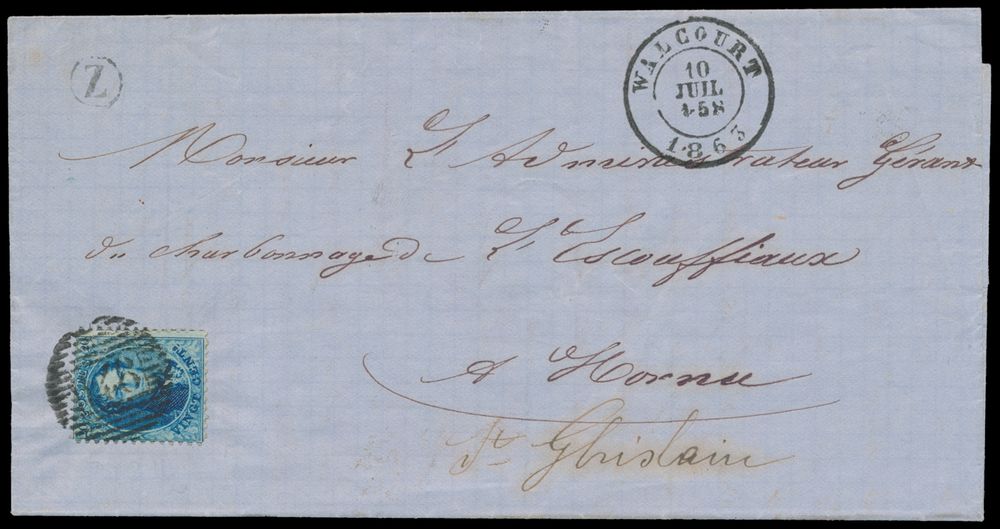 1338 image1863 N° 15 "20c. blue", on letter without contents, from Walcourt, cancelled P.148, dated 10 July 1863, to Hornu with receipt mark St.-Ghislain, beautiful postbox "Z" in circle black (Silenrieux), vf(Image 1) (Image 2)