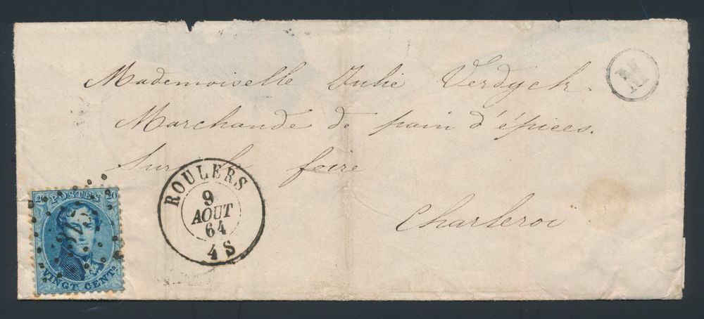 1340 image1864 N° 15 "20c. blue", on cover, cancel Pt.315-Rouleurs, dated 9 August 64, to Charleroi, post box "M" in circle black (not described in la Poste Rurale), for the specialist, vf/f(Image 1) (Image 2)