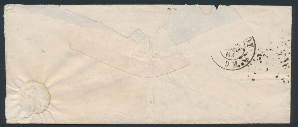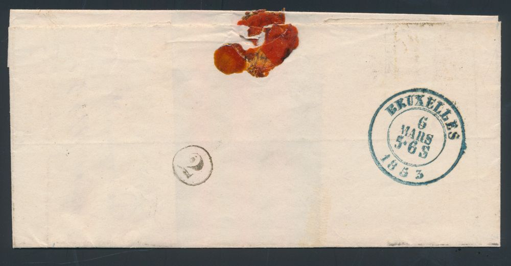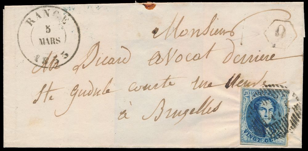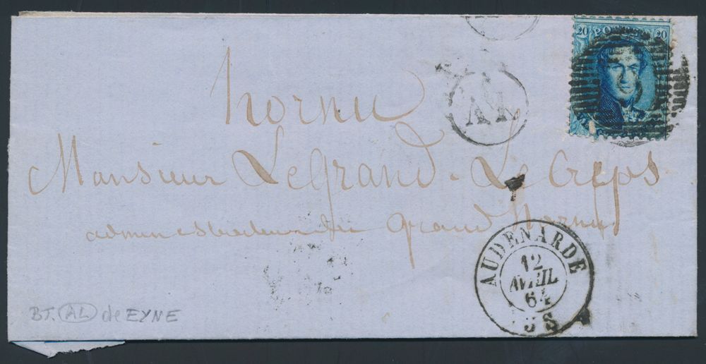 1339 image1864 N° 15 "20c. blue", stamp has and unprinted stain at lower left, cancelled P.9-Audenaarde, dated 12 April 1864, to Hornu, with arrival postmark "St.-Ghislain", difficult to read postbox, probably "AL" or "AR" in circle black, the letter address is Eyne, for the specialist, vf(Image 1) (Image 2)
