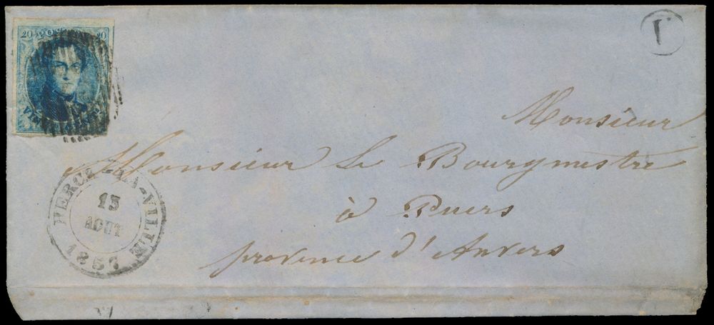 1333 image1857 N° 7 "20c. blue", fully margined on cover, from D.23-Herck-la-ville, dated 15 August 1857, to Puers, nice post box mark "U" in circle black "Haelen", vf/f (COBA +€50)(Image 1) (Image 2)
