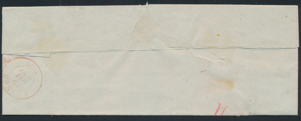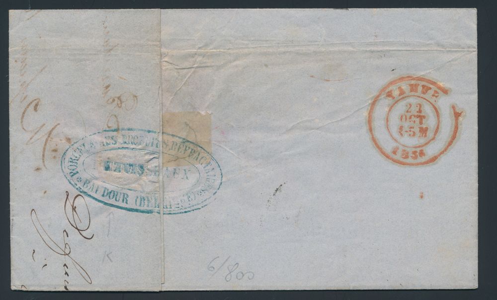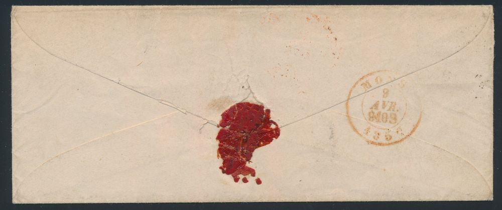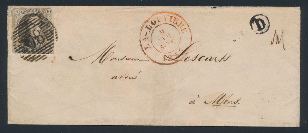 1331 image1857 N° 6 "10c. brown", letter envelope without contents, cancelled P.68-La-Louvière, fully margined, dated 9 April 1857, to Mons, letter box "D" in circle black, not described in "La Poste Rurale" for the 1850 period, though described for 1868 (Houdeng-Aimeries), one of the first letters with this letter box, vf(Image 1) (Image 2)