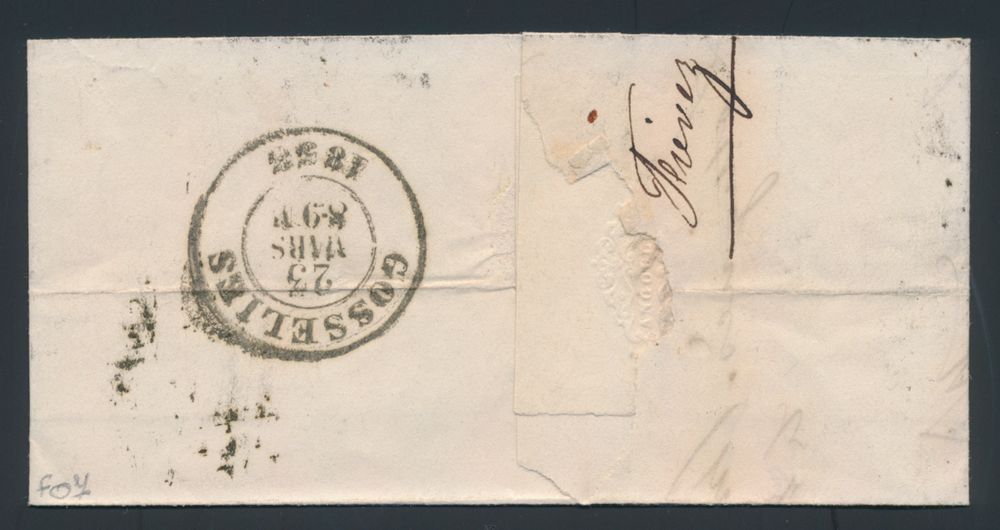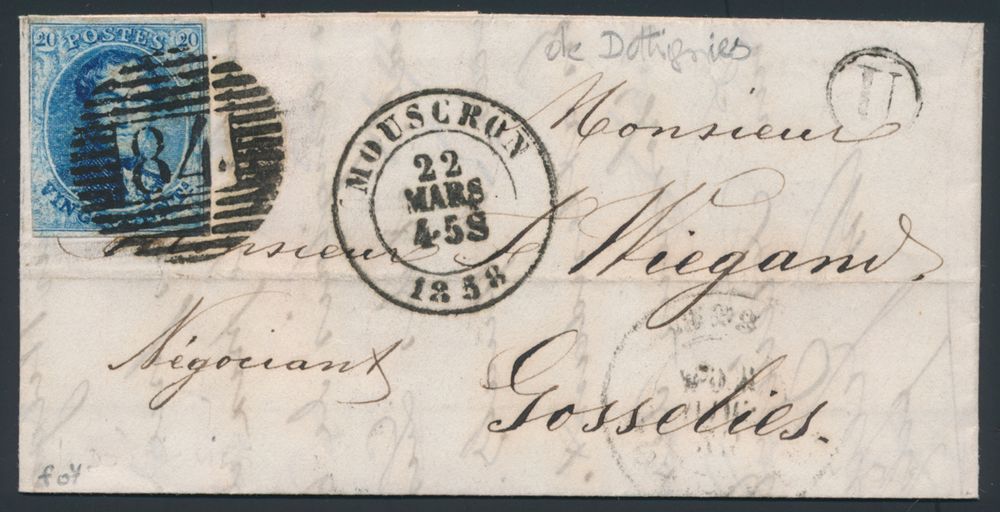 1334 image1858 N° 7 "20c. blue", on letter with contents, incised, cancelled P.84-Mouscron, dated 22 August 1858, to Gosselies, postbox stamp "U" (Dottegnies) in circle cancel black, vf/f(Image 1) (Image 2)
