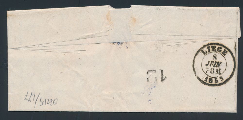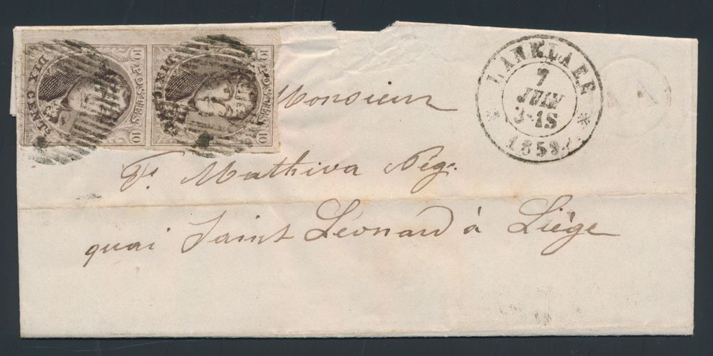 1335 imageN° 10A (In pair), on letter with afst. D. 66 'Lanklaer' (with neigbour and margin) 7 June 1859 + post office box letter from Boorsheim 'AA', to Liege, vf/f (OBP €75 + Coba €60)(Image 1) (Image 2)