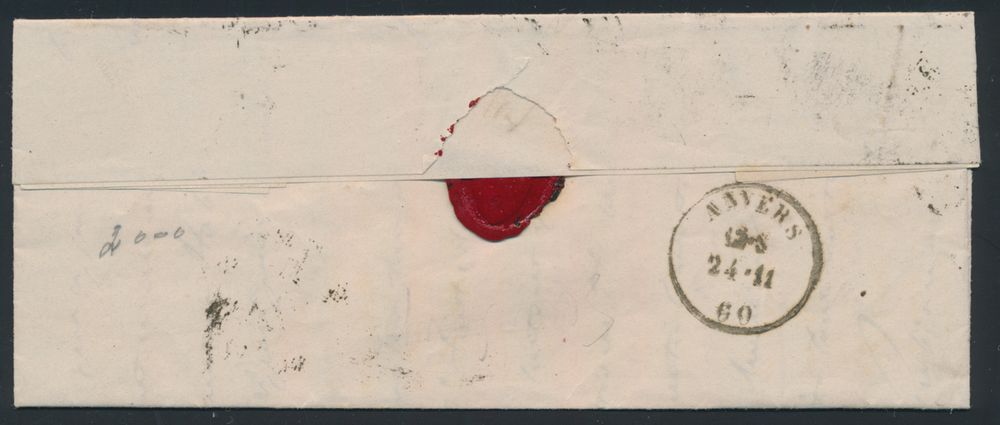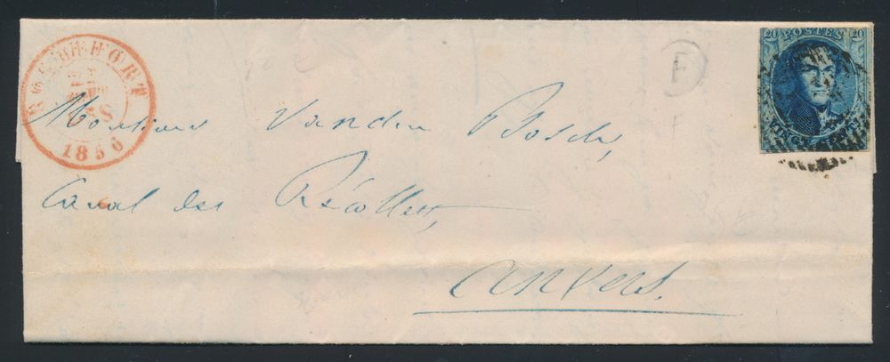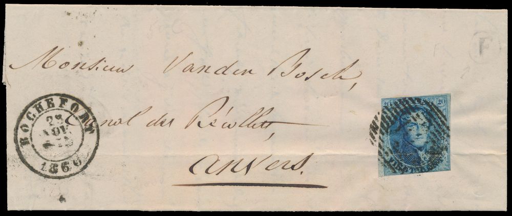 1337 PWST image1860 N° 11A "20c. blue", letter with contents, cancelled P.101-Rochefort, not fully margined, dated 25 November 1860, to Anvers, post box "F" in circle black, not described in "La Poste Rurale" in 1850 or in 1868, manuscript "Serinchamps" in the document, this post box was assigned to the letter "H" (but with question mark), nice proof of the other post box mark, for the specialist, vf(Image 1) (Image 2)
