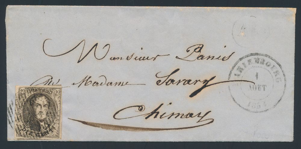 1324 imageN° 6, (with 2 neigbour) on letter with D.24 Mariembourg 1 Aug 1854, postbox letter cover AT, to Chimay, vf (OBP €17.50 + Coba €15)(Image 1) (Image 2)