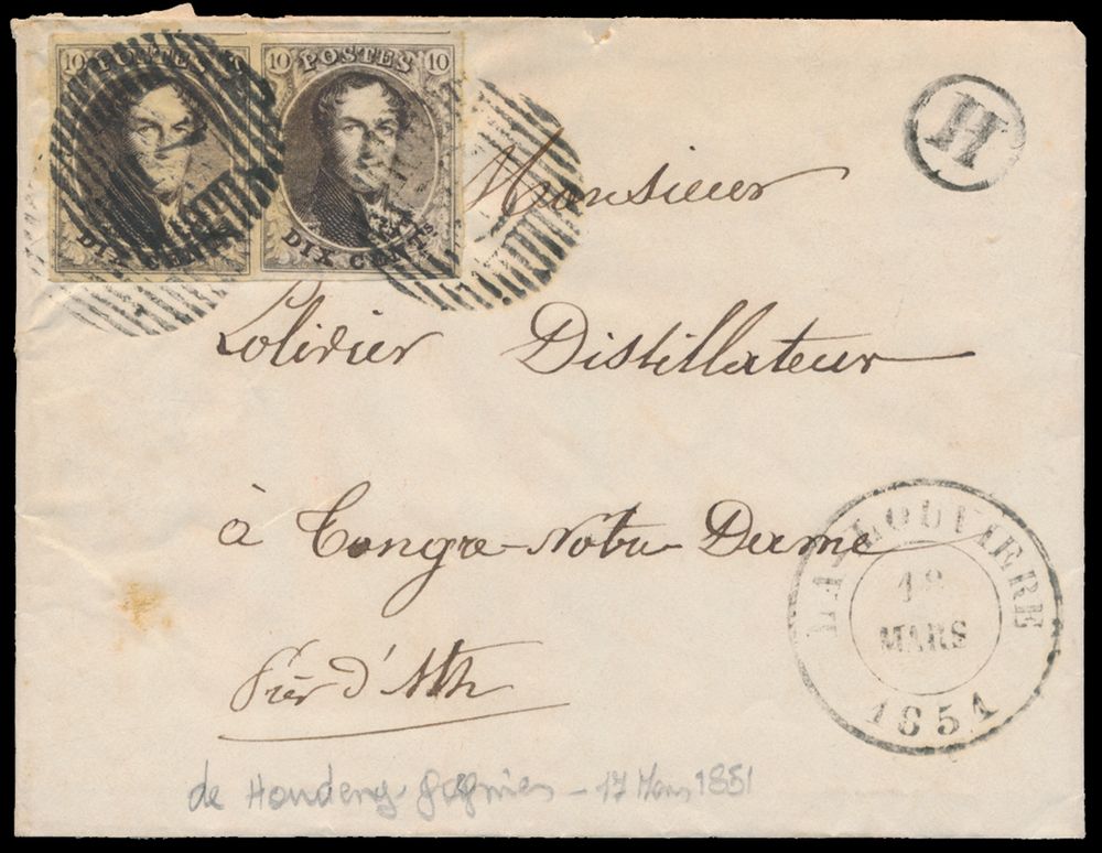 1322 image1851 N° 3 "10c. brown", in pair, fully margined with 2 upper corners, on letter with contents, cancelled P.65-La-Louvière, dated 18 March 1851 (black departure stamp), to Tongres Notre Dame with receipt mark "Ath. PO Box H" (Houdeng-Goegnies) in circle black, vf (OBP €450)(Image 1) (Image 2)