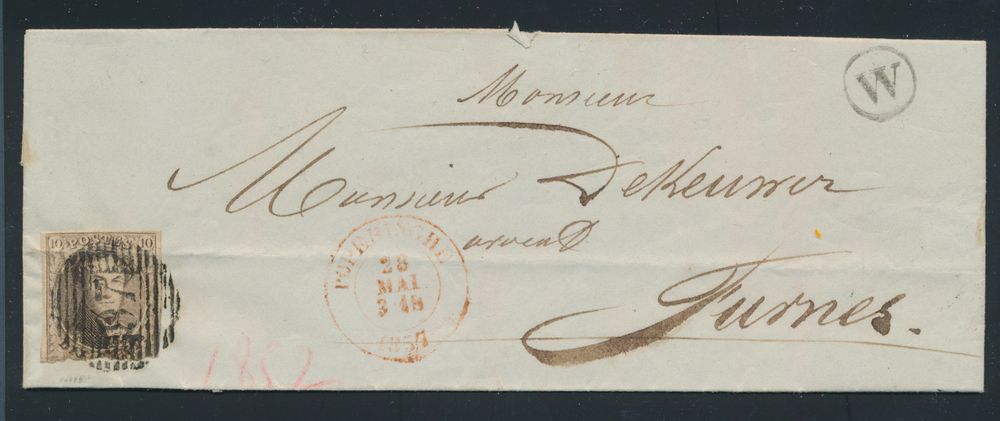 1332 image1857 N° 6 "10c. brown", letter with contents, cancelled P.97-Poperinghe, not fully margined, dated 28 May 1857, to Furnes (Veurne), post box "W" in circle black, "Watou", identical to letter heading, nice letter, vf(Image 1) (Image 2)