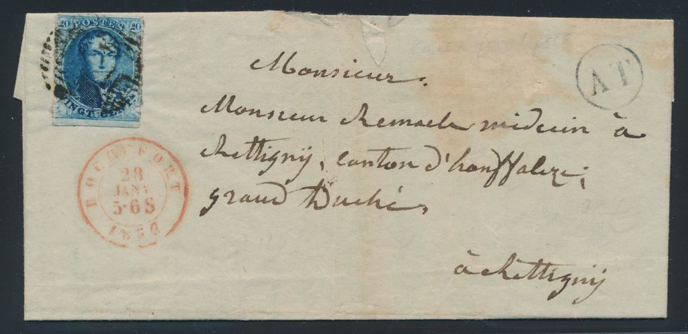 1330 image1857 N° 7 "20c. blue", letter with contents, cancelled P.101-Rochefort, not fully margined, dated 28 January 1857, to "Rettigny - canton Houffalize", arrival postmark is "Houffalize", post box "AT" in circle black, Villers/Lesse, manuscript "Villlers sur lesse" in the document, vf(Image 1) (Image 2)