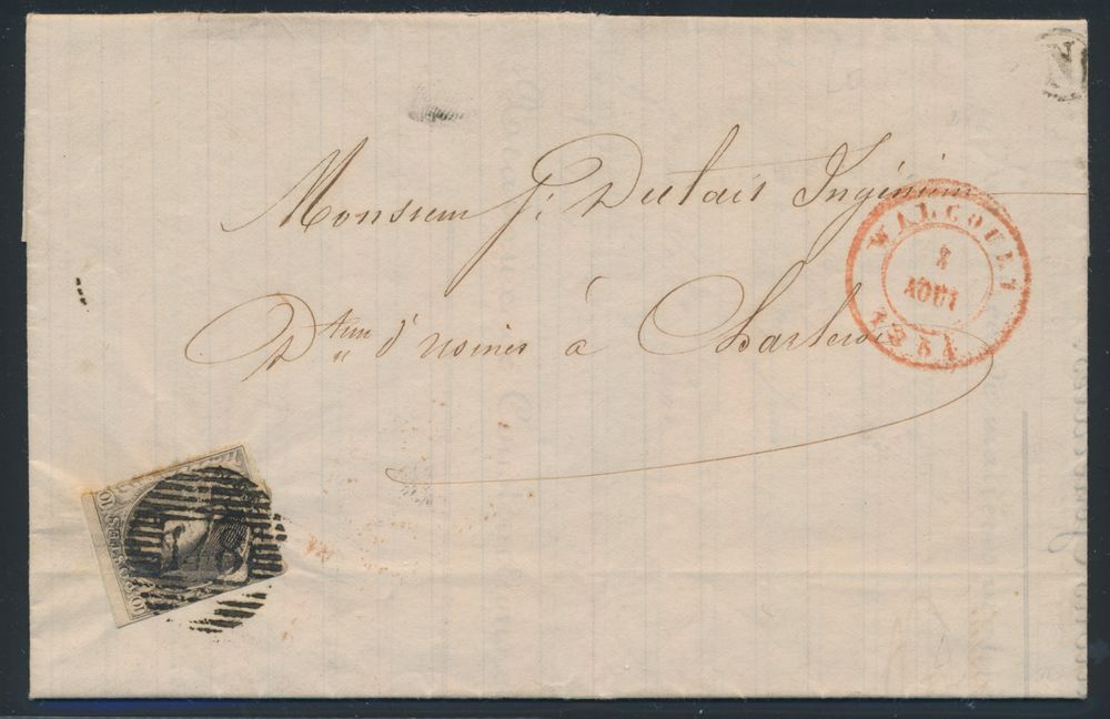 1325 image1854 N° 6 "10c. brown", letter with contents, cancelled P.148-Walcourt, not fully margined, dated 2 August 1854, to Charleroi, PO Box "N" in circle black, Laneffe, the letter head is "Hauts-Journaux de Laneffe", nice historical document, vf(Image 1) (Image 2)