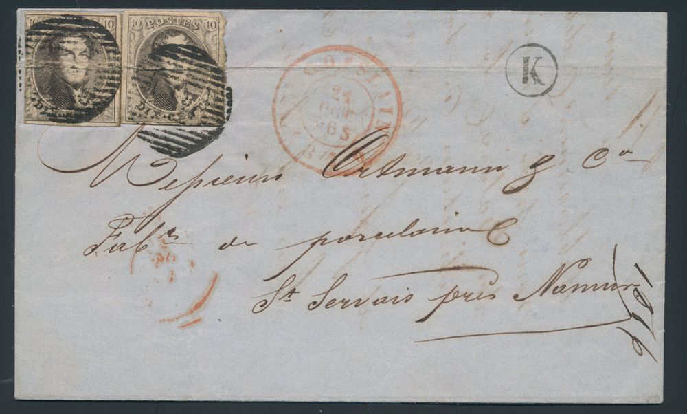 1329 image1856 N° 6 "10c. brown", letter with contents, two items (1 fully margined with beautiful griffe in upper margin), cancelled P.103-St.-Ghislain, dated 21 Oct 1856, to St.-Servais (près Namur), post box "K" in circle black, Baudour, also the manuscript in the letter, vf(Image 1) (Image 2)