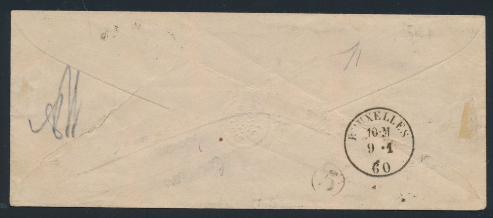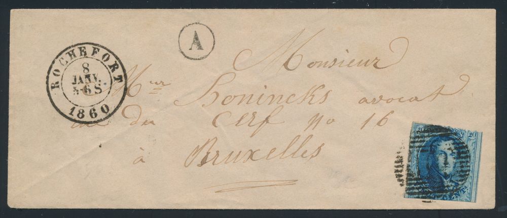 1336 image1860 N° 11A "20c. blue", letter envelope without contents, cancelled P.101-Rochefort, not fully margined with neigbour, dated 8 January 1860, to Bruxelles, post box "A" in circle black, not described in "La Poste Rurale" in 1850 or in 1868, vf(Image 1) (Image 2)