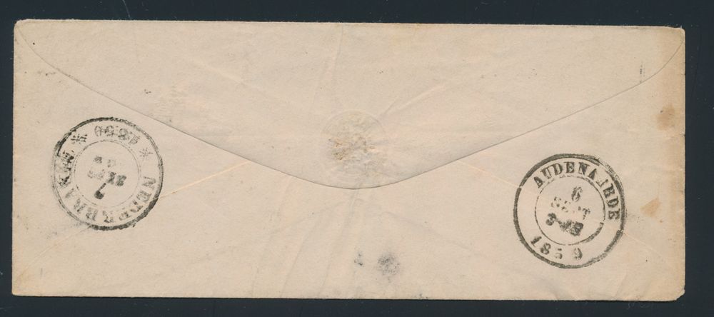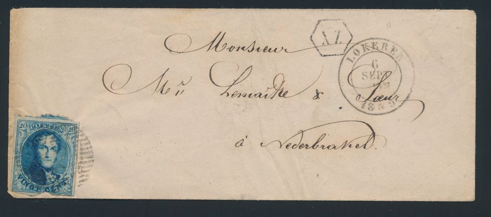 1341 image1868 N° 11A "20c. blue", letter envelope without contents, cancelled P.75-Lokeren, not fully margined with upper border, dated 6 September 1859, to Nederbrakel (nice arrival postmark), postbox "AZ" in hexagon black, not described in "La Poste Rurale" in 1850 or in 1868, vf(Image 1) (Image 2)