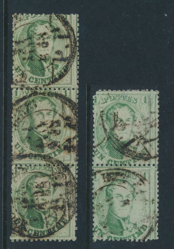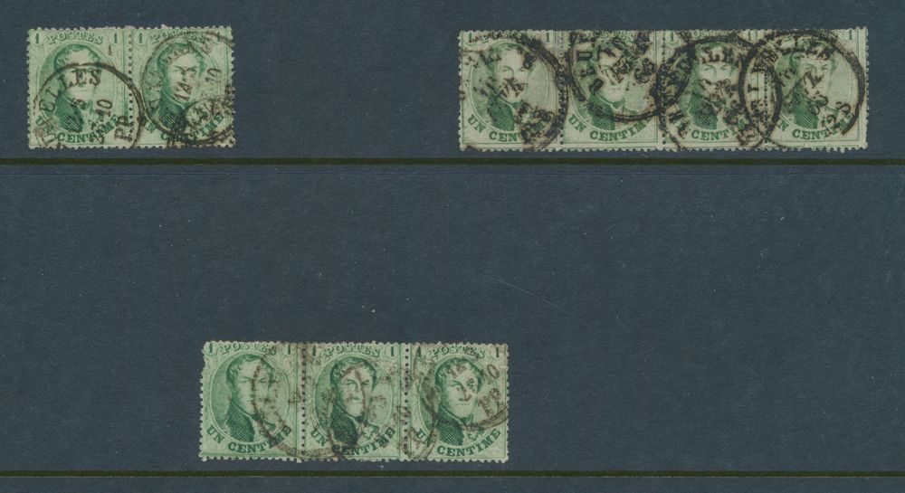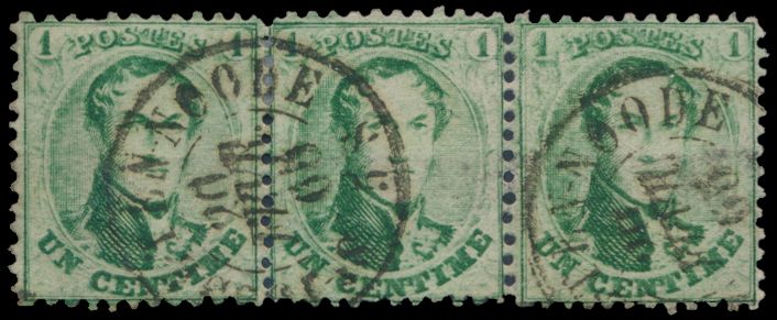 1353 0 imageN° 13A "1c. green", decent centring, in strip of 3, with only two cancellations (irregular), double circle cancel of Saint-Josse Ten Noode, dated 20 February 65, vf (OBP €185)(Image 1) (All Images)