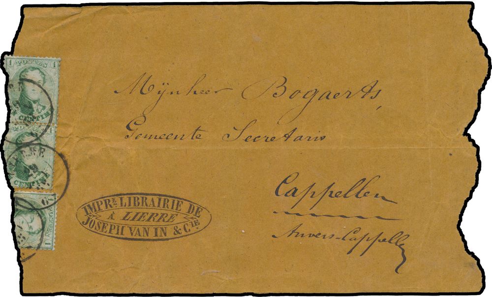 1349 imageN° 13 "1c. green", on wrapper, stamps are torn where wrapper is opened, cancelled Lierre, dd. 1865, to Cappellen, nice firm stamp "Impr-Librairie de Joseph van In & Cie à Lierre", vf/f/to be checked(Image 1) (All Images)