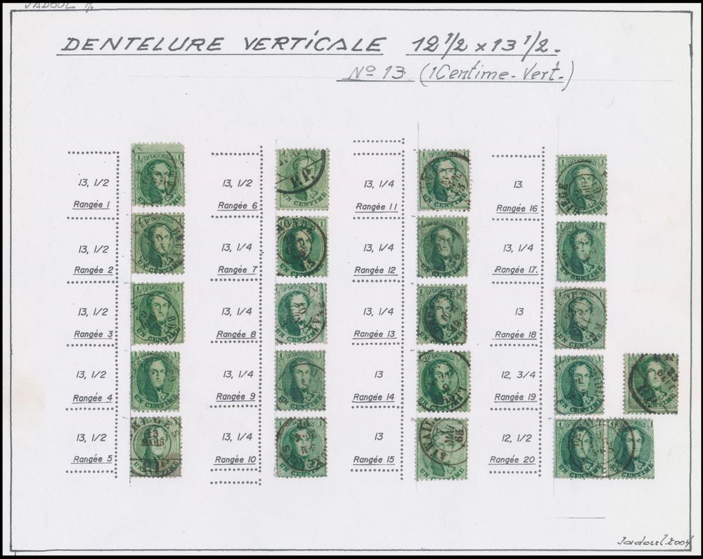 1343 0 imageN° 13 "1c. green", study on vertical perfs 12 1/2 x 13 1/2 , stamps presented with example on the course of perfs 20 rows, ex. Jadoul, vf(Image 1) (All Images)