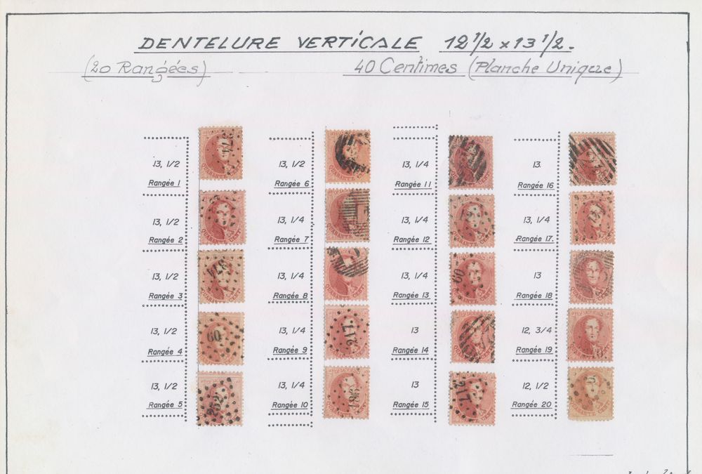 1400 0 imageN° 16 "40c. crimson", study on vertical perfs 12 1/2 x 13 1/2, stamps presented with example on the course of the perfs of 20 rows, ex. Jadoul, vf(Image 1) (All Images)