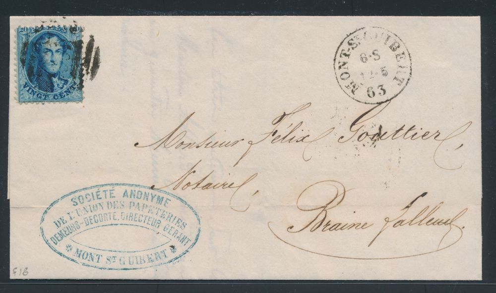1391 imageN° 15 "20c. blue", on letter with part content, from P.198-Mont-St.Guibert (8 bars), dated 12 mai 1863, to Braine-l'Alleud, with fine departure stamp, illegible bar obliterator, vf (OBP €30)(Image 1) (Image 2)