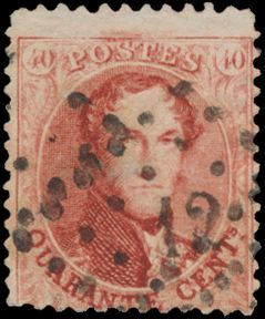 1394 0 imageN° 16A "40c. Crimson", perfs 12 1/2 x 13 1/2, bar obliterator "50" GOSSELIES (OBP €30 + COBA €15), vf(Image 1) (All Images)