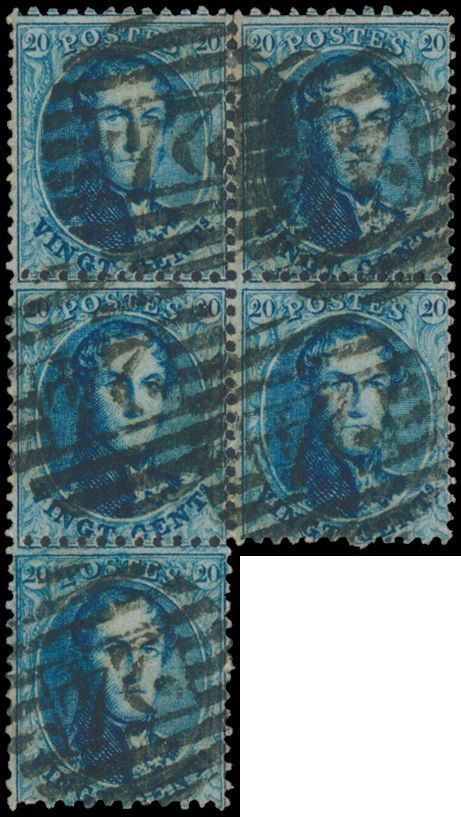 1388 0 imageN° 15A "20c. blue" in souvenir sheet of 5, cancel P.24-Bruxelles (10-bars), superb condition, Vf (COBA ++€120)(Image 1) (All Images)